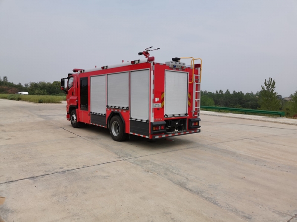 电气配置 | 驾驶室顶部前端为长排100W警报器及警灯,车身后配有24V/60W火场照明灯一只,车辆两侧上方各配有红蓝相配的爆闪灯,下方安装安全标志灯,乘员室、器材箱、 泵房内均装有照明灯,回转警灯开关、通讯设备预备接口。 |