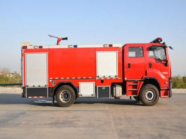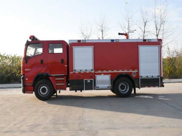 电气配置 | 驾驶室顶部前端为长排100W警报器及警灯,车身后配有24V/60W火场照明灯一只,车辆两侧上方各配有红蓝相配的爆闪灯,下方安装安全标志灯,乘员室、器材箱、 泵房内均装有照明灯,回转警灯开关、通讯设备预备接口。 |