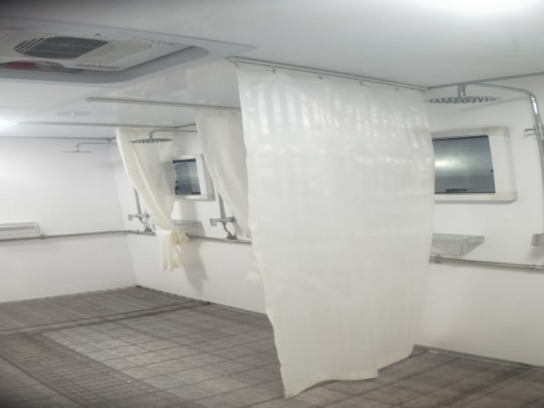 1、车内共有 3 个区域,分别为后更衣区、中淋浴区、锅炉区燃油热水锅炉、不低于2.8KVA 柴油发电机、水泵、精密过滤器、暖风机、灭火器、通风窗、照明灯;淋浴间设置 12 个淋浴喷头、不锈钢水箱、皂盒、通风窗、照明灯;内设要有更衣柜、衣帽钩、照明灯、换气扇等配套设备。(配套设备漏掉*需增加)。