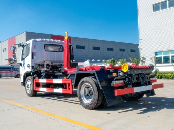 ◇上装配置:强度合金钢一体式主勾臂,加强型副梁,铸钢尾托轮,手自一体室内外液压操控,上装提升能力6000KG, 液压完成上箱+下箱+锁紧+自卸等作业,实现一车配多箱的循环转运。可采用加强型上装,伸缩臂,油缸加粗,加装液压支腿,搭配建筑垃圾箱使用,提升能力10000Kg。
