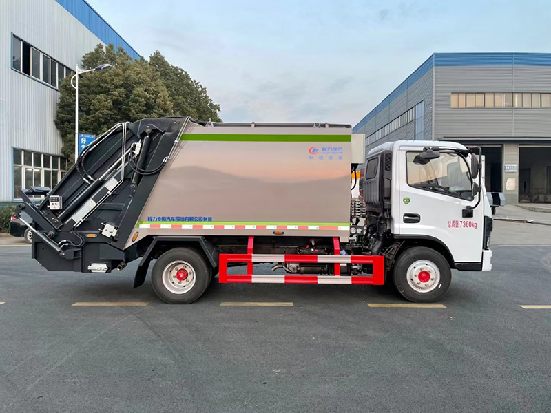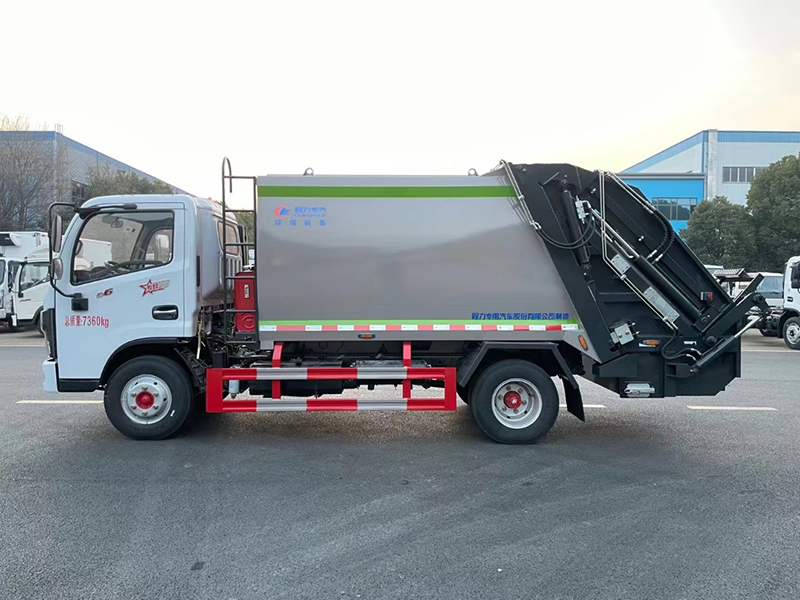 上装配置:上装为弧形箱体结构,采用Q345(局部采用T710)高强度板制作。有效容积6.5立方(240L塑料垃圾桶有效装载100-120桶),采用中梅大通径五联手气一体多路阀,全系标配背压阀(增加双向压缩比),合资铁壳液压齿轮泵,嘉善取力器,加强型挂捅后翻转机构(可选装三角斗、全密封斗、摆臂等翻转机构),外置滑板缸结构,石墨烯尼龙滑块,长沙福力CAN总线控制系统,尾部带有硅胶控制面板,标配无线遥,带光电感应保护装置,标配后污水箱,(中联样6双排污口),可加装侧边无水箱。