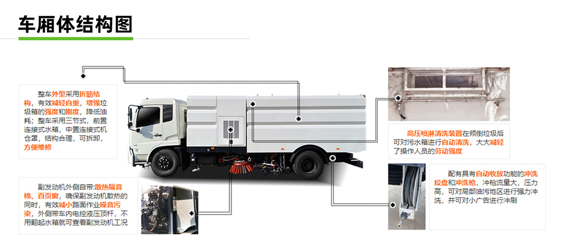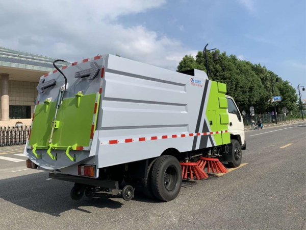 带扫盘4把,江铃副发动机;大力马达;施耐德控件开关;台湾电磁阀组;免维护自分离式离合器;免维护风机;不锈钢水箱;不锈钢垃圾箱;尾部LED箭头灯;手动泵应急系统;刷臂转动机构使用高新耐磨工程隔套,免打黄油;精密冷弯无缝液压油管。