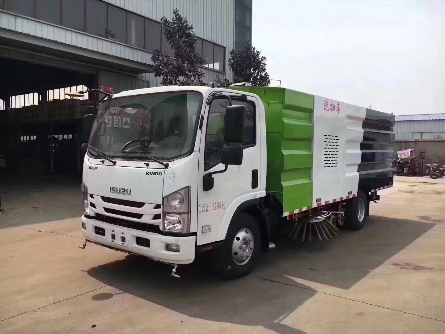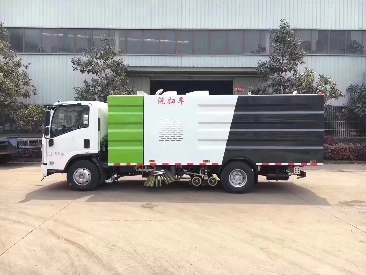 上装配置:副发动机是康明斯140马力,箱体材质为304不锈钢,垃圾箱容积4.5立方,清水箱容积5立方,清扫宽度:2800-3200mm,保洁作业速度15-20km/h, 最大清扫能力48000㎡/h , 德国进口高压泵(前冲/侧喷/中喷/后喷雾/冲洗水枪/垃圾箱自洁装置),水过滤器,管路,不锈钢喷架,高压喷嘴,清吸降尘左右前扫盘,吸尘吸盘,带2个中置扫盘,LPC电子控制,一键操作,尾部厢体外观为方形豪华型,日本三洋马达;万向高压路沿清洗喷头,威龙低压泵(前冲);不锈钢管高压管路;德国控制器, PLC一键控制;尾部LED箭头灯;副机转速表、副机水温表、机油温度报警装置、各种操作控制开关;倒车及洗扫状态室内监视器。18m高压冲洗卷盘。清洗压力10MPa;吸入颗粒度:≥100mm。