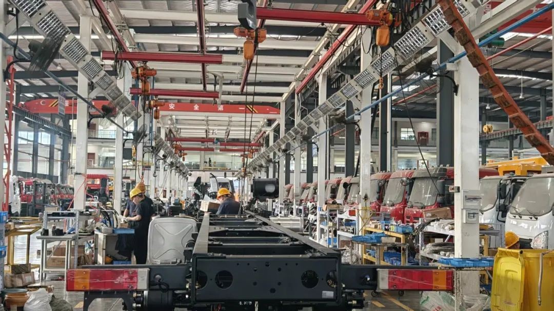 图二(上):程力重卡底盘装配线上,一大早就开足马力忙生产。