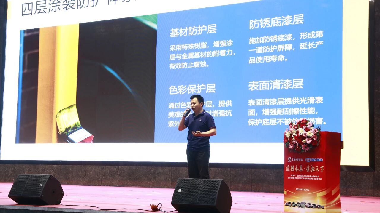 在致词中,王总重点而专业的介绍了东风股份D9底盘的优势与亮点,强调了东风股份第九代底盘,凭借其卓越的动力性能、可靠的承载能力及灵活的改装适配性,成为专用车领域的热门选择,并从以下从技术亮点和适配场景两方面展开说明: