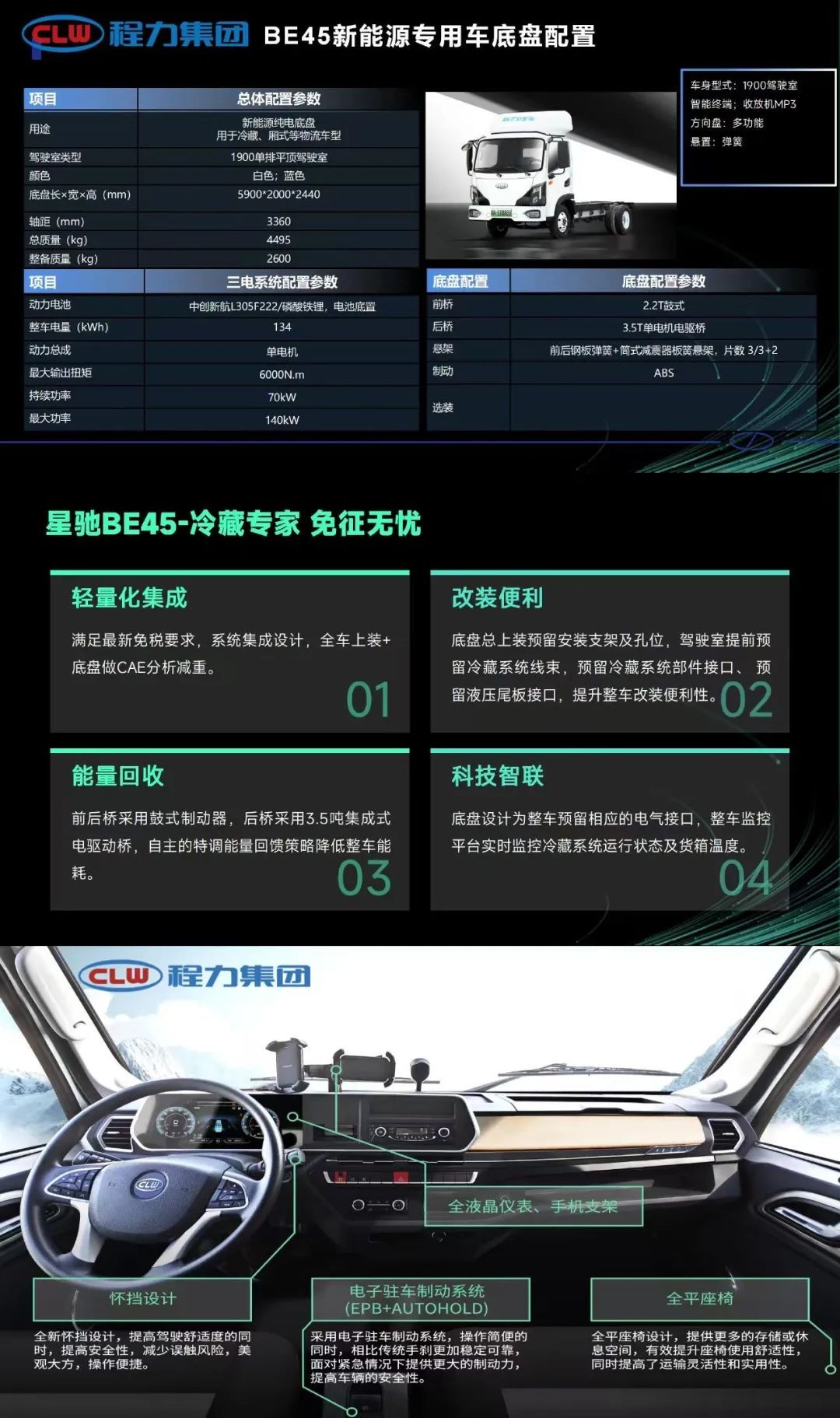 程力“星驰”BE45新能源商用车底盘,适用于改装全系环冷链物流、市政园林、高空作业、旅居车辆,颜值担当时尚实用。