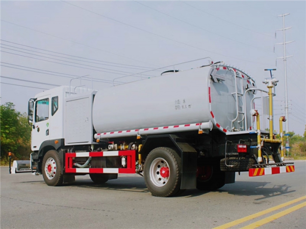 高压水泵由副发动机→传动轴→皮带传动→电磁离合器→联轴器驱动;低压水路系统,采用双级叶轮离心泵,效率高、洒水宽度大、水枪射程远,低压水泵由底盘变速器取力器通过传动轴直接传动。
