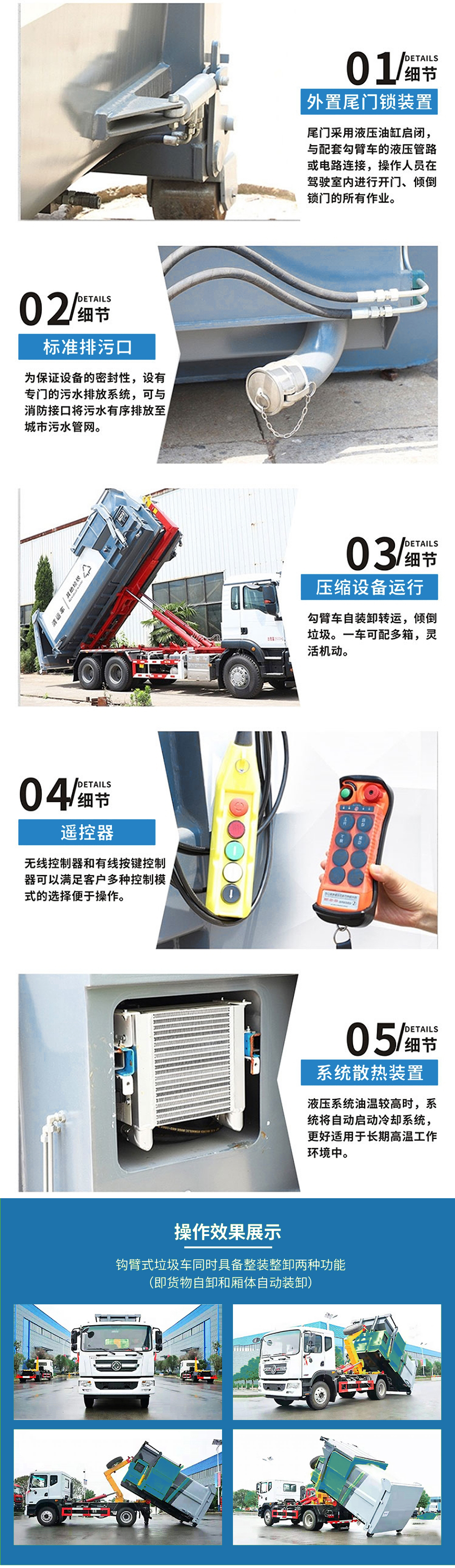 主机箱体包含:主机箱体、压缩仓、压头、压缩油缸、滑轮、液压系统、电控系统等组成。其主要结构件采用Q345高强度结构钢焊接成成,具有较有的耐磨性;主机箱体上的滑轮与滑台导轨配合,使主机能相对滑台滑动,液压电控系统固定安装于主机箱体上,整体简洁美观。箱体容积18m³,匹配20吨后双桥车厢可卸式垃圾车。