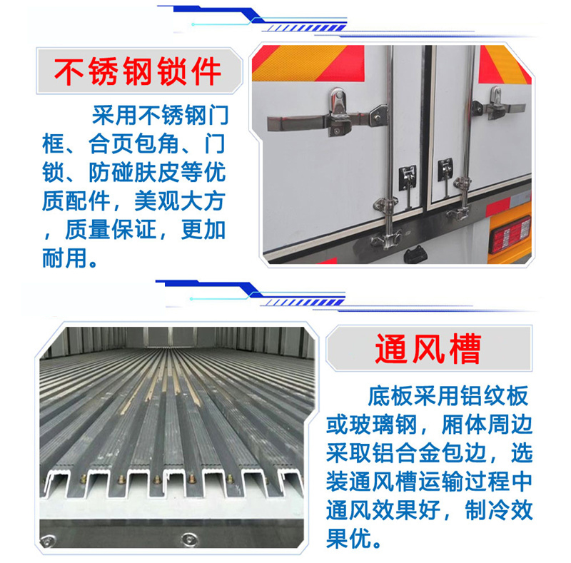 | 其他 | 车厢顶部封闭,不可开启,导流罩为选装件,选装无侧开门结构,选装厢体侧面开门样式,选装制冷量相同的制冷机组。ABS系统型号:APG3550500A,ABS系统生产厂家:浙江亚太机电股份有限公司;ABS系统型号: VIE ABS-II,ABS系统生产厂家: 浙江万安科技股份有限公司。侧防护采用冷弯型钢/Q235-B,螺栓连接,后防护采用冷弯型钢/Q235-B,焊接连接,后防护截面高度尺寸100mm,截面宽度尺寸50mm,下边缘离地高度420mm。发动机型号/油耗申报值对应关系为:JX4D30A6H/11.4L/100km,JX4D30C6H/11.4L/100km,JX4D30B6H/11.4L/100km。 | ||
