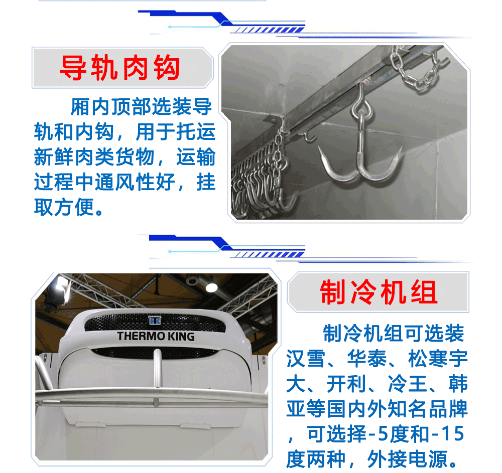 选装冷机:可根据客户的用车需求选择不同的机组,客户可选-5°C、-10°C、 -15°C、-18至20°C冷藏机组, 冷藏机组品牌有国产劲达K牌、韩亚、汉雪、华泰、松寒、凯雪等冷藏机组,进口冷藏机组品牌有:美国开利、美国冷王.冷藏机组分为独立机组和分体机组!