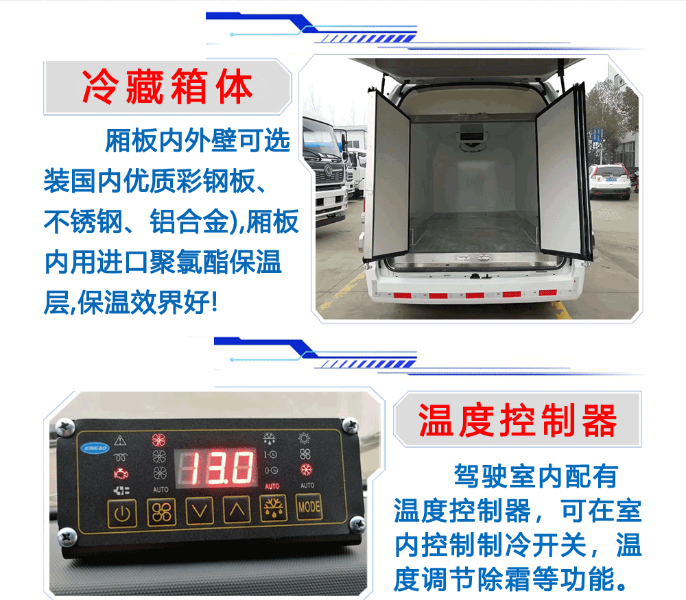 厢体配置:厢体板采用市面上最先进技术-负压加热抽真空技术,保温性能达到国家A级标准厢体。内部尺寸为: 容积为 立方,厢体内外面料采用最新款纳米玻璃钢(不吸光、隔热性好、硬度强、抗氧化)厢体厚度为8cm ,内衬骨架为防锈处理优质轻钢型材镀锌管,保温材料为无空隙填充聚氨酯发泡,厢体底部为铝合金花纹板或选平面纳米玻璃钢,厢体采用镀锌不锈钢包角,加厚型铝合金包边,后门框为不锈钢,加厚型不锈钢后门]合页及锁件,全车所有不锈钢部位均使用食品级304不锈钢制造,厢体内部采用ED照明灯及厢体示宽灯。
