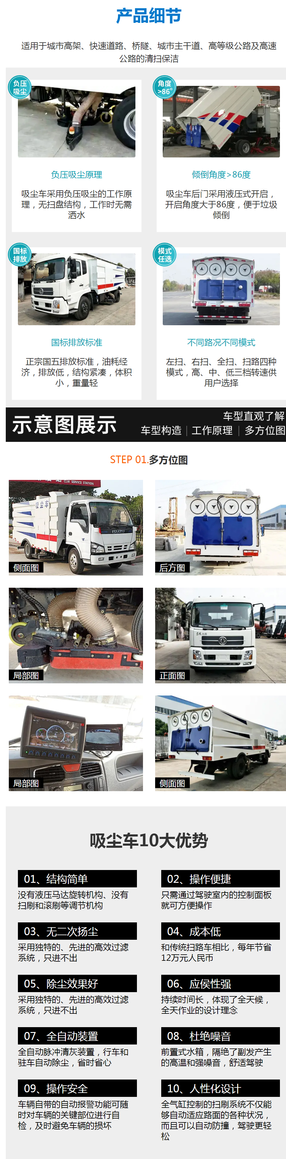 东风小多利卡5方吸尘车专用配置:尘箱:4立方米,水箱:1立方米;中置吸盘、江铃五十铃副发动机、施耐德控制开关、海普瑞斯电磁阀组、无级变速自动离合器、免维护离心式风机、高精度垃圾箱过滤系统(最高可达0.5微米),不锈钢垃圾箱、进口脉冲阀、垃圾箱举升自卸、尾部LED箭头灯、车尾雾状喷水润湿功能、倒车影像、手动泵应急系统。